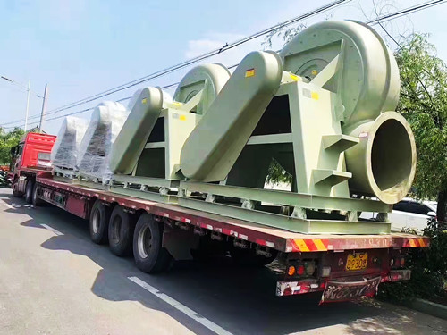 在前文中介紹過有關于玻璃鋼離心風機的方向方面的知識,簡單來說風機的方向主要是為了方便風機的安裝工作。風機的方向主要體現(xiàn)在風機的出風口位置,當風機的出風口平吹時說明風機的方向為180°或者0°。以玻璃鋼風機葉輪的中心點做一道水平線,當出風口在上方時代表風機的方向為180°,當出風口在水平線下方時則代表風機的方向為0°。下面是0°方向的玻璃鋼離心風機安排發(fā)貨圖。