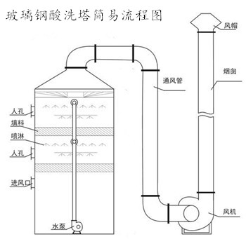玻璃鋼酸洗塔外部的氣體經由玻璃鋼離心式風機以管道之后進入塔內,經過多孔板進入填料層,在填料層上有來自于噴嘴分布下來的噴淋液體,并且在填料上形成一種液態膜,氣體流經填料空隙時,與填料液膜接觸并進行吸收或中和反應之后,氣體繼續向上走,經過幾次吸收或中和后的氣體經除霧器收集后,經由出風口排出塔外。而液膜上的液體則經過液體收集器回收至指定地點。